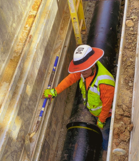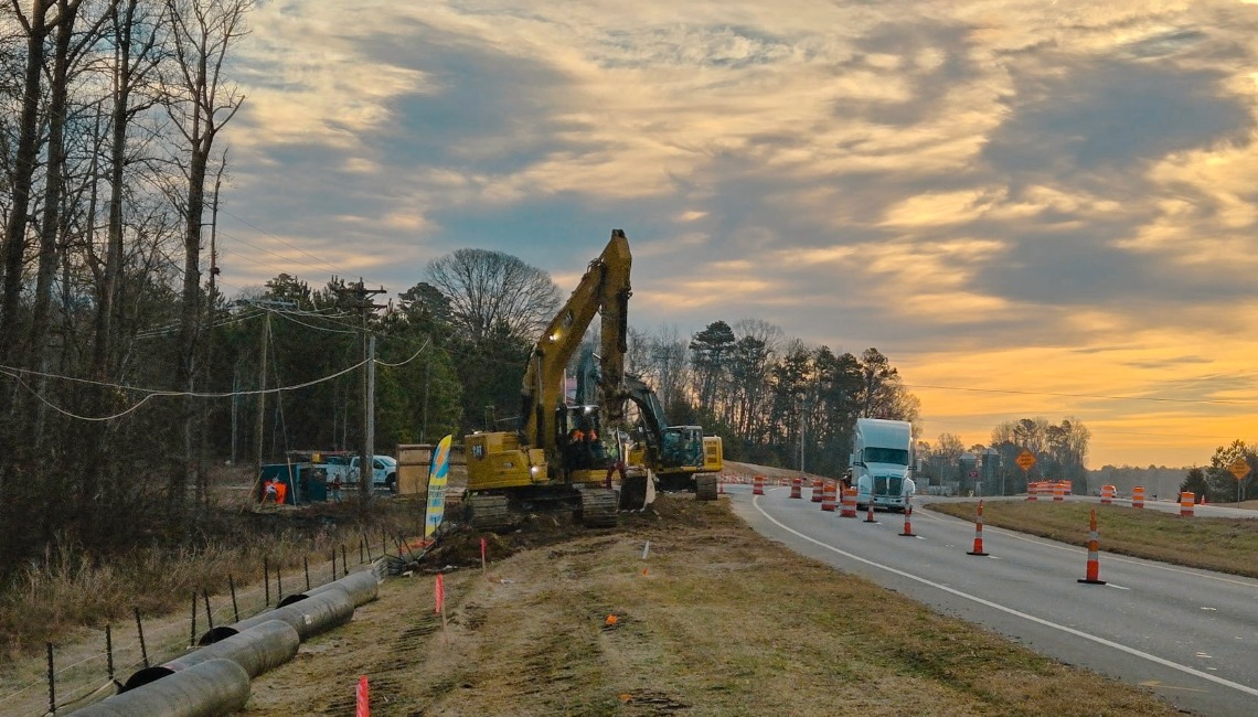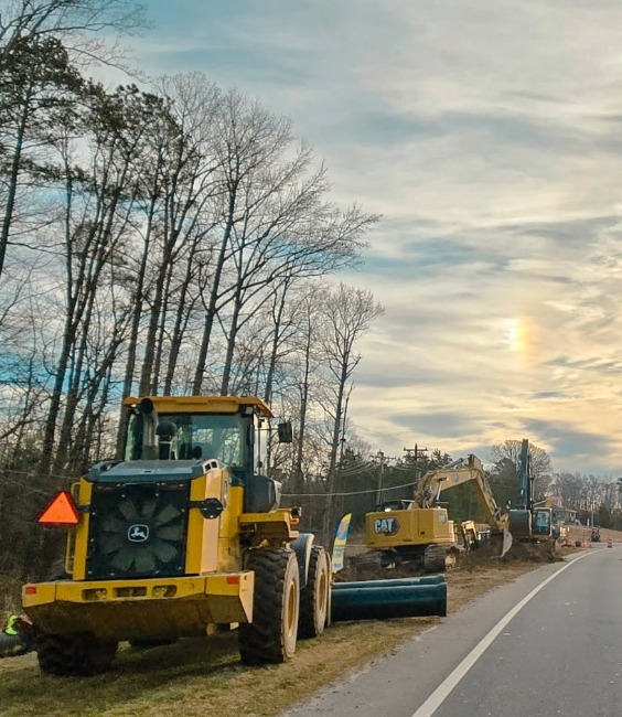 Construction is advancing in stages: Section 4 is complete, Section 3 and 2 are in active installation. Remaining work includes the booster pump station and final river and roadway crossings. Once testing and final connections are complete, the system is scheduled for substantial completion in 2026, delivering reliable water service to the North Carolina megasite and surrounding communities.
